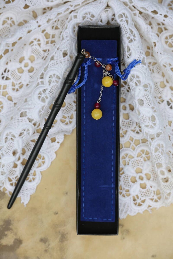 This elegant hairpin is handcrafted from black-lacquered wood and decorated with dyed yellow and pink jade, as well as natural agate. A delicate yet strong chain made of soldered stainless steel adds a graceful, flowing touch and is highly durable.